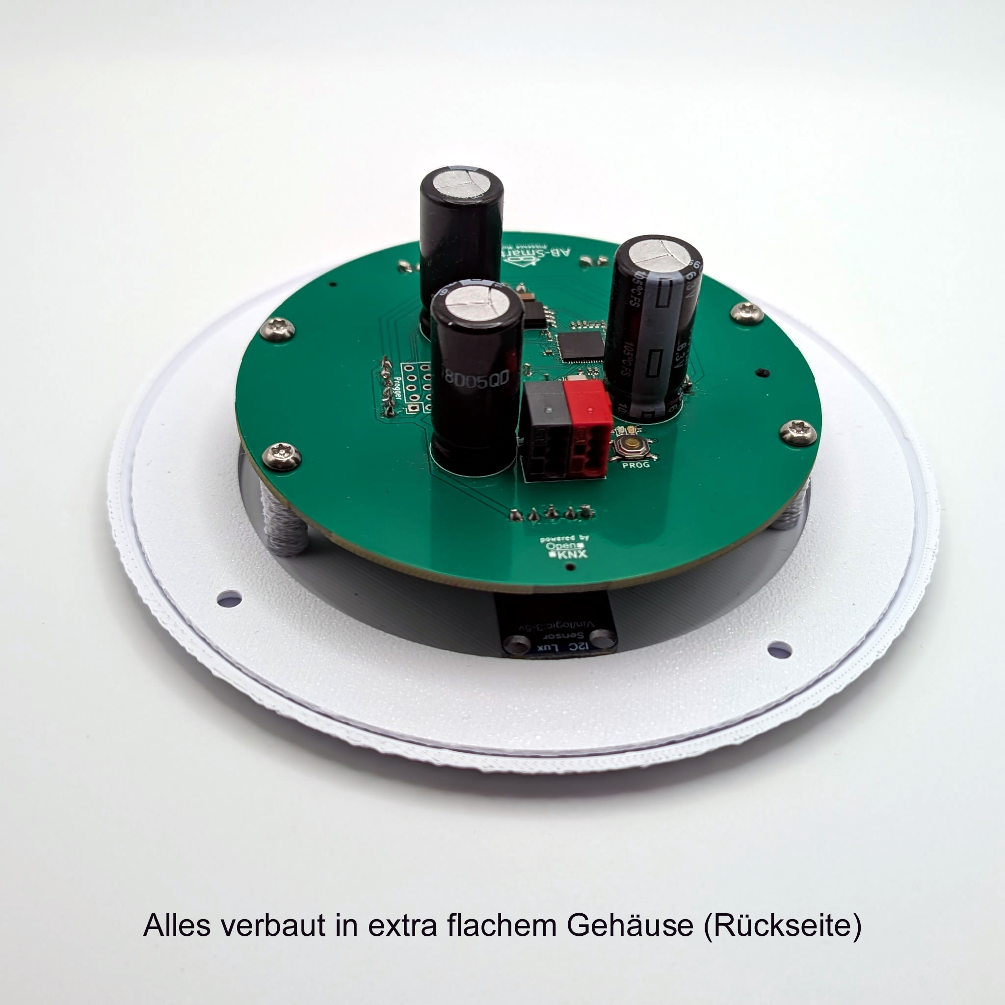 Die Basisplatine hat einen Durchmesser von 90 mm, der maximale Durchmesser des Gehäuses beträgt 130 mm und es ist lediglich rund 20 mm (bei der Aufputz-Variante 30 mm) hoch.